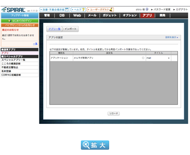 今回のアップデートでスパイラルは、データベース、フォーム、一覧表などの設定オブジェクトを、利用用途に応じて「アプリ」として自由にパッケージングできます。パッケージングされた「アプリ」は、業務に必要な操作メニューやユーザーに提供するWebのトップ画面など、様々なアクセシビリティを追加でき、Webアプリケーションを簡単に使えるの新しい使い方を提供します。