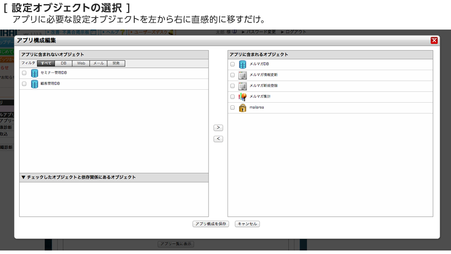 「アプリ」は直感的な新しいユーザーインターフェースを提供します。DBやWEBなど種類ごとに整理されていた設定オブジェクトを、利用用途ごとにパッケージングする事で、自分に必要な機能のみを集約した「アプリ」のユーザーインターフェースから簡単に操作できます。プロジェクトの全体管理としてプロジェクト単位でパッケージングしてもお使いいただけますが、同じプロジェクト内でも担当者によって業務が異なり、操作する機能が異なります。さらに細分化して、サポート履歴管理担当、セミナー担当など、担当者の業務単位の「アプリ」を作成すれば、業務に必要な機能だけを集約した、効率的なユーザーインターフェースで日々の運用を行えます。