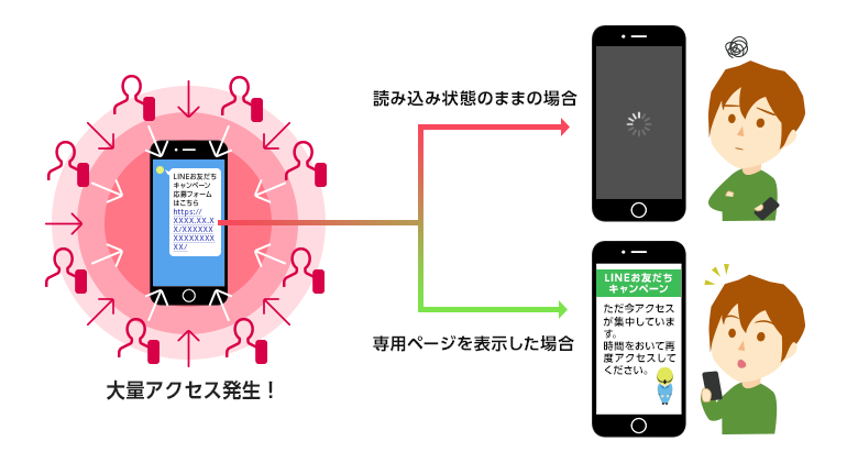 通常、大規模アクセスが発生しシステムが処理しきれなくなると、「接続中」などの状態でページが真っ白な表示になってしまったり読み込み処理のまま、いつまでも応答しなくなってしまうなどの状態に陥ってしまいます。このような場合、ユーザーの多くは表示されないことにストレスを感じ、諦めてしまいがちです。